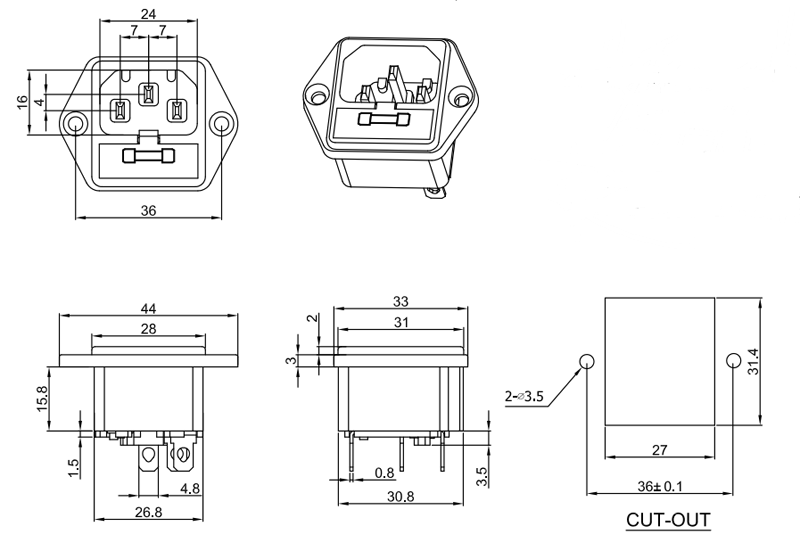 治具插座S-03系列,單插、二合一、三合一保險插座等多種規格,大電流10A ,15A,產品通過UL VDE CCC CB等認證,常見于家用電器,音響功放機等